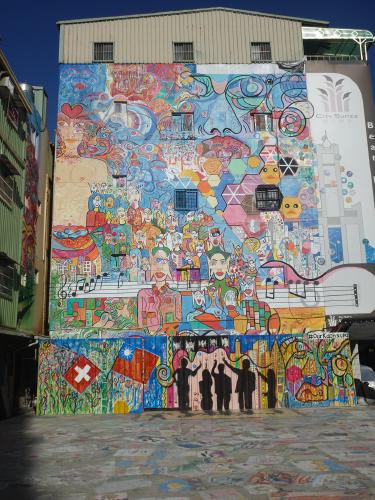 Auf dem Weg dorthin entdeckte ich ein Wandbild, auf dem die taiwanesische und die schweizerische Fahne nebeneinander abgebildet waren – warum, blieb mir unklar.